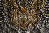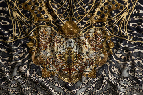 Graced with wild majesty and golden cascades, the Armada Rectangular V Neck Kaftan captures our gaze with swirls of leopard print defined by lavish gold baroque detailing and ornate architecture. Adorning hand-embellished crystals, this luxury