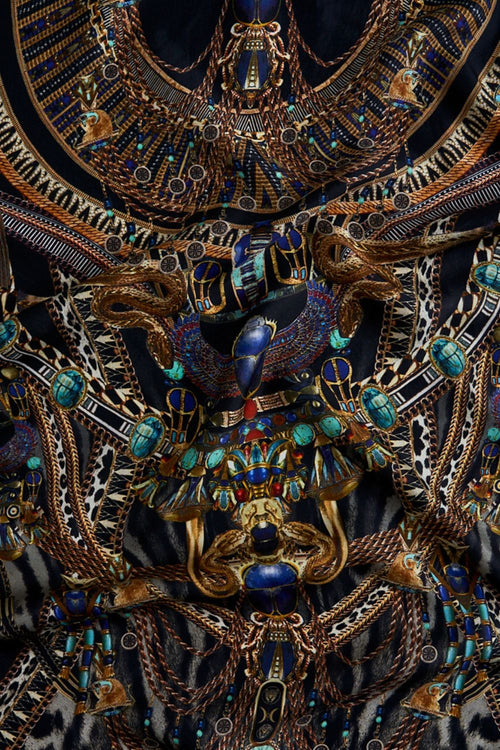 The Cat Worship Batwing Kaftan explores a world of lavish leopard print laced with adornments of intricate jewels. This luxury silk kaftan features a soft tailored neckline that flows into a generously drapey relaxed fit throughout the body that falls to midi length. The wide 3/4 length batwing sleeves are finished with wide button up cuffs . Explore more from the House Of The Sun collection.