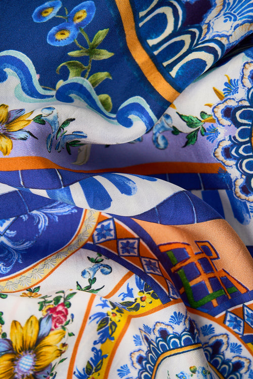 Designed in Australia, the Tiles Darls Silk Shrug reads the language of florals and tiles, blue and orange hues intertwine, a celebration of artisan hands and enduring beauty. Lovingly handcrafted, this luxury silk shrug features