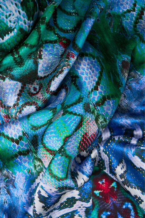 Designed in Australia, The Land Of Wonder Long Off Shoulder Frill Dress With Straps embodies a mystical fusion of snakeskin and oceanic hues, celebrating the art of rebirth and reinvention. Lovingly handcrafted, this frill dress is designed to captivate with an alluring off-shoulder neckline and delicate gathered details. The soft puff sleeves add a touch of romance, while the flounced skirt exudes a playful elegance. With a relaxed maxi length hemline that dances at the ankle.