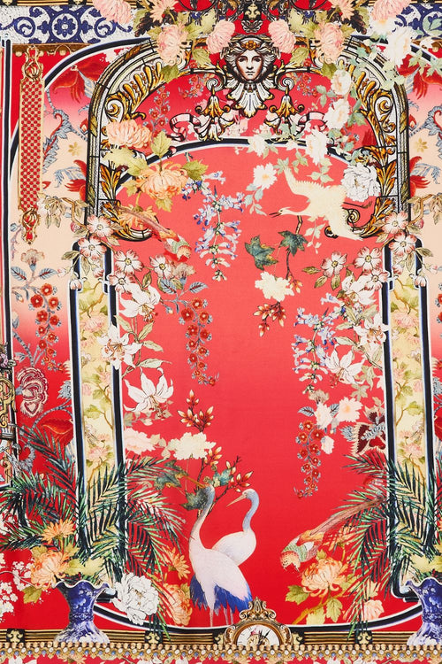 Designed in Australia, The Lisboa Luxe Strappy Dress with Twist Front unveils an oasis where cranes soar among lush ferns, intricate tilework, and dreamlike ceramics—a soft crimson sanctuary, each detail whispering stories of wonder. Lovingly