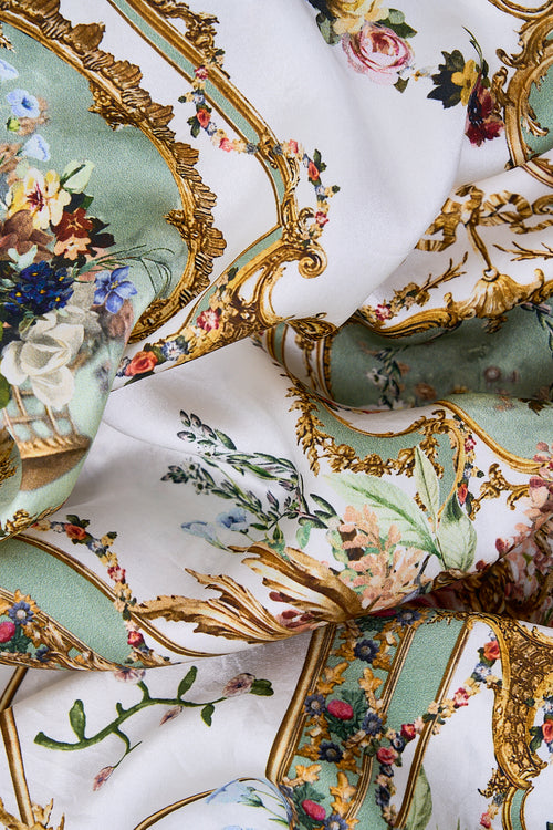 Designed in Australia, the Dressing Room Drama Tiered Dress With Neck Frill unveils a black base fused with florals and gilded arches, echoing the regal opulence of the Palace of Queluz—a poetic nod to throne