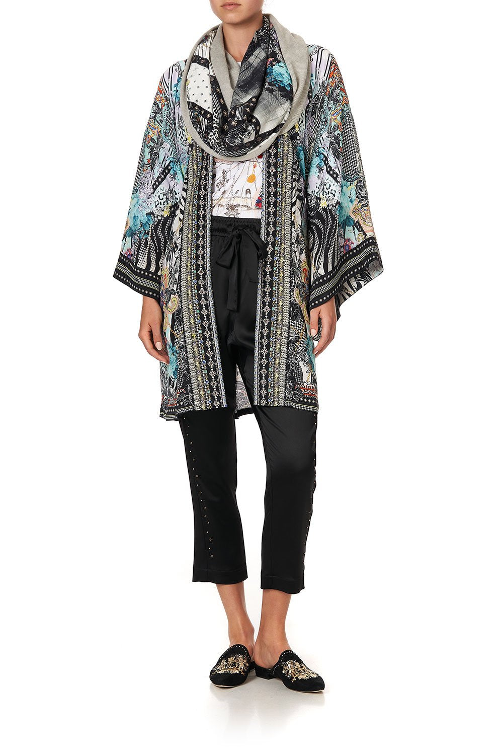 Houndstooth and horticulture clash elegantly with paisleys and zebra print across the pure silk canvas of the Think Kinks Kimono With Tie Belt. Inspired by a British patchwork of punk, this mega mix of prints