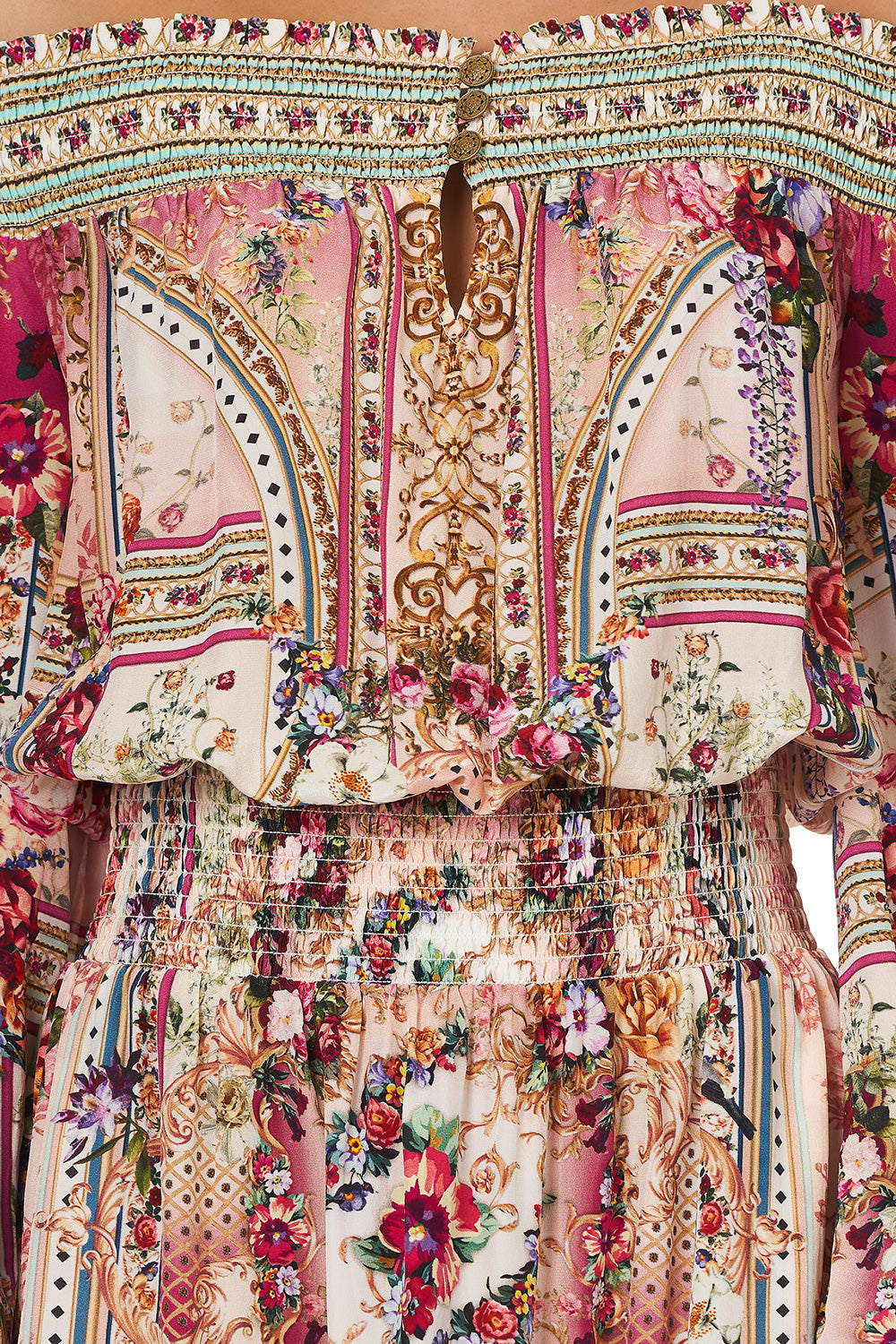 A charming summer mini, the Summoned By A Rose Off Shoulder Short Dress in enriched with the sweet seduction of tea room gossip. A backdrop of ombre pink silk is a feminine canvas for pretty