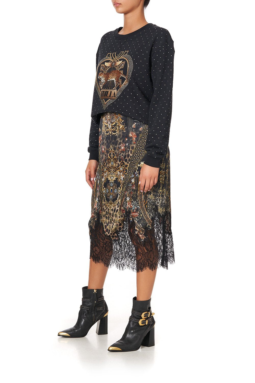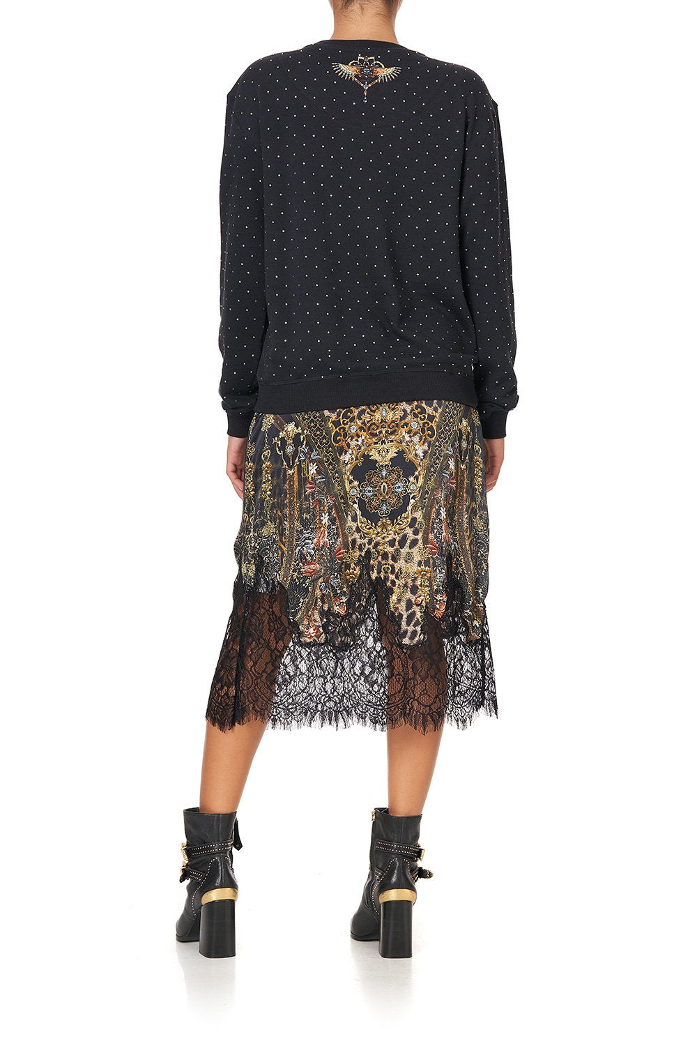 Mirroring the bygone wonder of the swinging sixties, the Abingdon Palace Round Neck Sweater radiates the celebrated eccentricity of London’s first destination boutique. This printed jumper is cut in a relaxed fit that features a round neckline and ribbed hem and cuffs to keep the cold at bay this winter. Fashioned in a statement black print with golden accents and gleaming hand placed crystals. Pair yours with CAMILLA printed leggings for a luxe streetwear look.