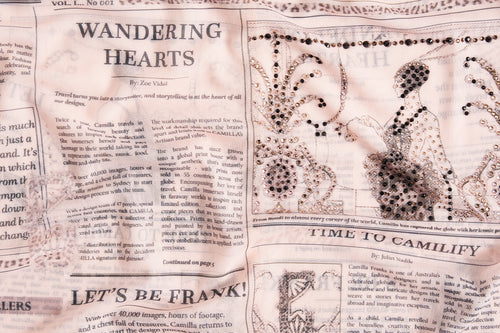 The Fame Fever Split Cuff Soft Coat is an immersion of drama and audience captivating headlines set against soft sepia tones. Crafted from a decadent CAMILLA printed silk, this luxury lightweight coat is home to embellished lapels and split cuff details, a tie to cinch in and accentuate the waist, structured shoulders to add shape and definition, and a relaxed boxy silhouette that falls into a midi length hemline. Lovingly handcrafted and designed in Australia, explore more from The Moral Of The Story: Act II collection.