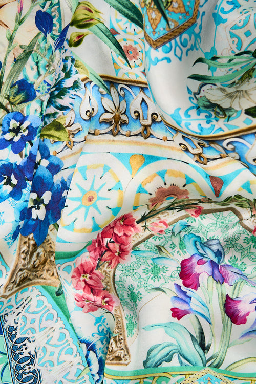 Designed in Australia, The Sunrise In Sintra Scoop Neck One Piece celebrates lush gardens and eclectic nineteenth-century architecture, where light blues and intricate tiles reflect exotic motifs, inviting you into botanical beauty. Lovingly handcrafted, this luxury one piece swimsuit features a fitted silhouette throughout the body that falls from an elegant scoop neckline. The high cut elongates the legline for an exceptionally sleek line.