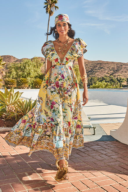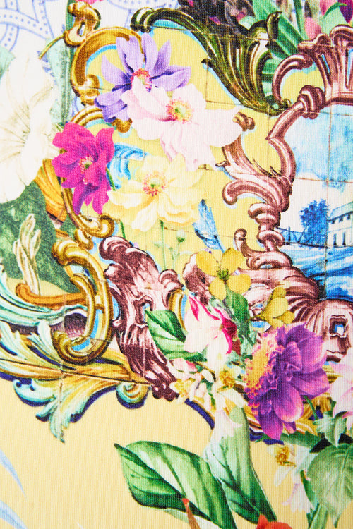 Designed in Australia, The Flor Fantástica Layered Short Sarong With Tie Front echoes the splendor of Queluz Palace, soft yellow hues bloom amidst florals inspired by its lush gardens. A celebration of nature's elegance and