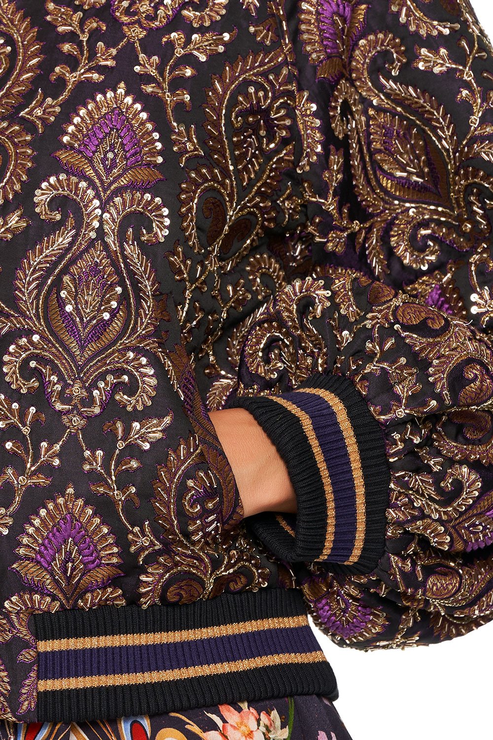 Embracing the beauty of the palatial gardens of Paris, the Wild Flower Blouson Sleeve Bomber exudes opulence. This lavish silk jacket with floral flourishes is fully lined and features sumptuous embroidery detail, a playful tassel zip pull, as well as delicate striped ribbing.