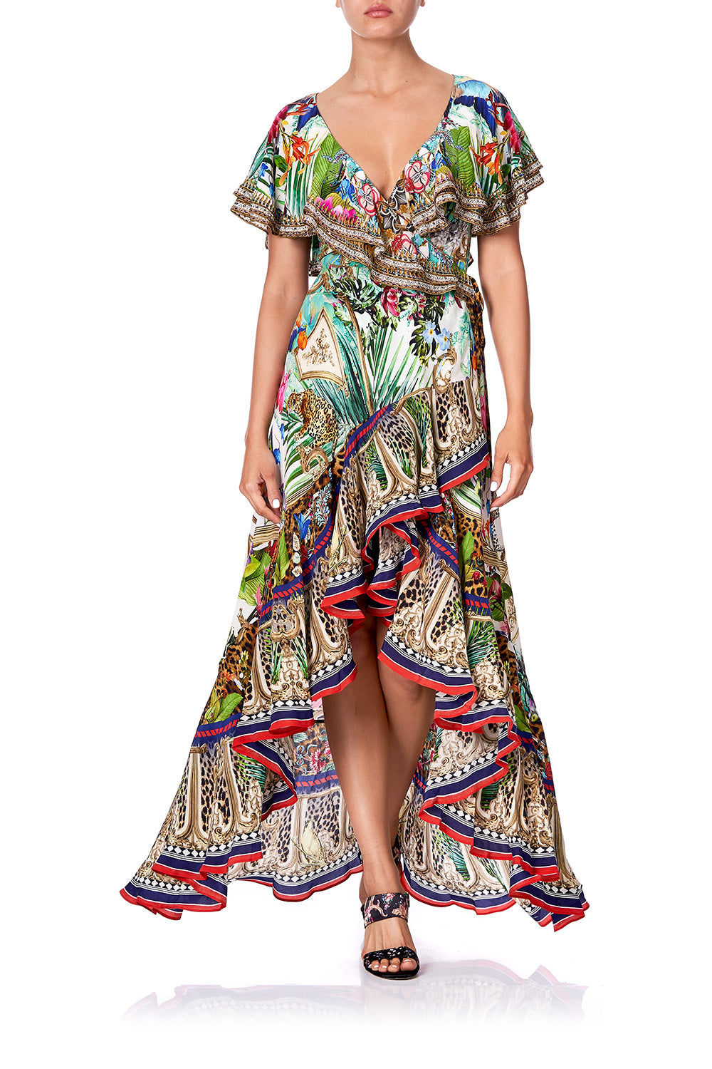 With tropical green flourishes and regal leopard print, the Champagne Coast Frill Hem Long Sleeve Dress is an ode to the luxurious revelries on the French Riviera. A vision of romance in tropical bloom, this feminine wrap-front gown is crafted from pure silk adorned with a petite waist tie, luminous crystal trims and a cascading frilled hemline destined to entrance.