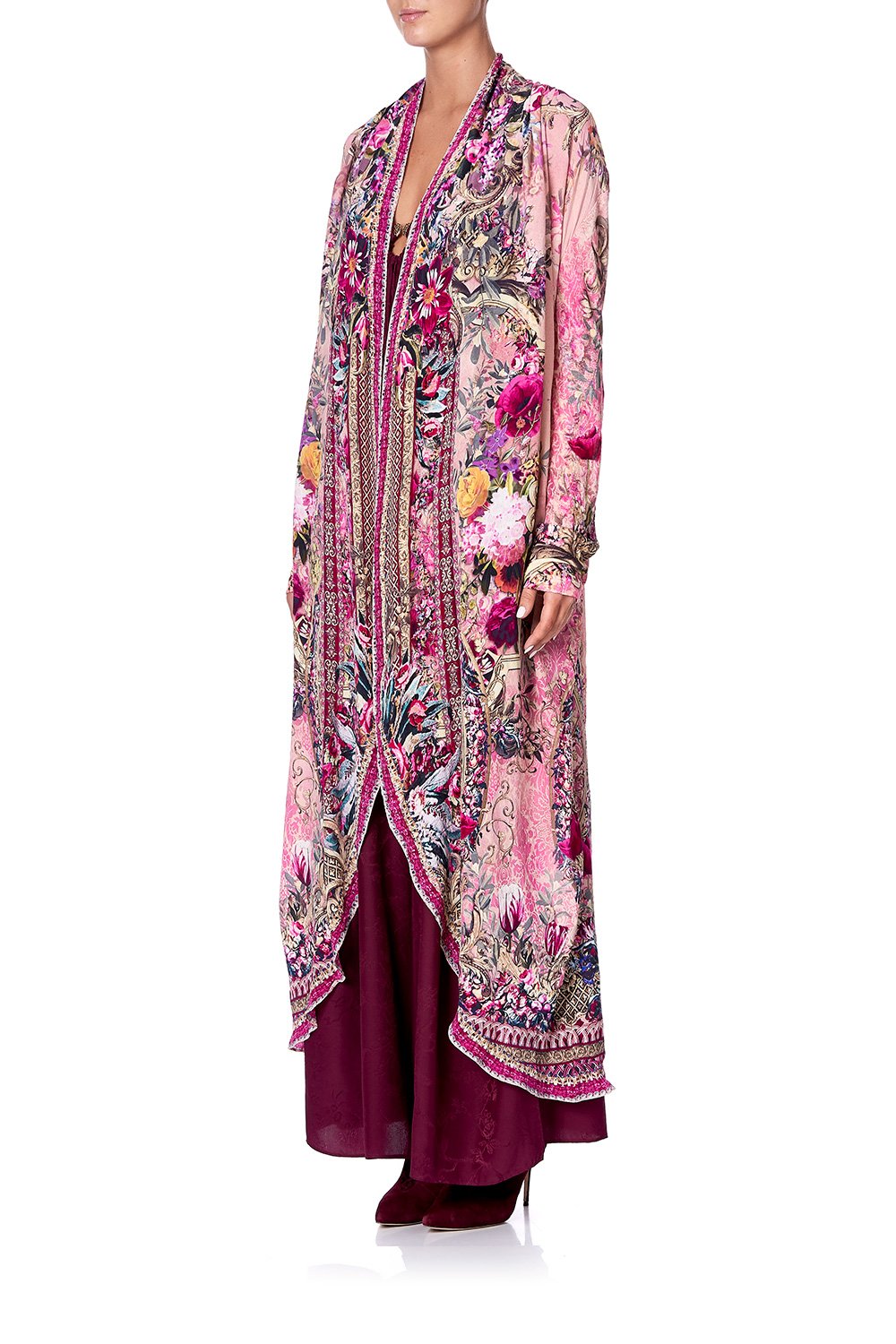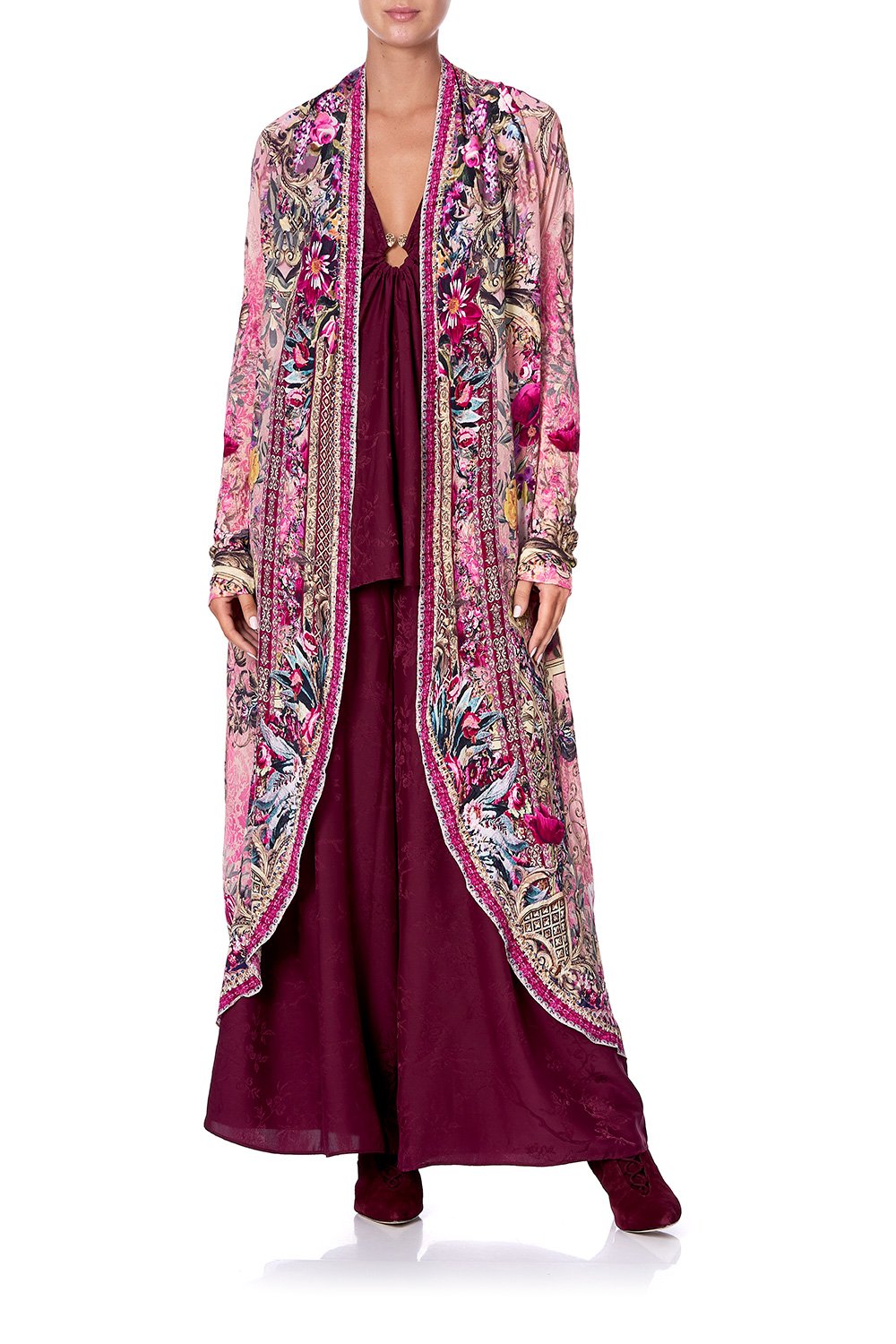 In honour of the ornate golden frames inside the Musée Nissim de Camondo – La Belle Long Casual Jacket with Pockets exudes elegant charm. This effortless silk coat features practical pockets, lace insert at side