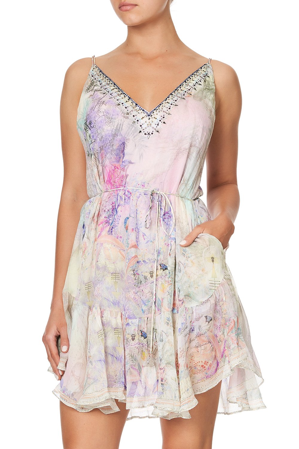 Enchanting mini dress, the Mermaid Milla Mini Dress with Ruffle Hem showcases a magical blend of pastel hues as canvas to dreamy native flora and fauna in a feminine ode to Milla's childhood adventures. This pure silk short dress features a flattering V-neckline, adjustable shoestring straps, draw-cord CAMILLA beaded waist tie and hidden in seam pockets finished with statement hand placed crystal embellishments adorning the neckline.