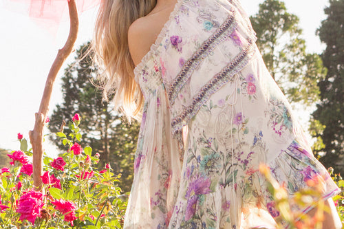 A heaven-sent maxi dress immersed with hand-painted florals at full bloom, the Forever Far Off Shoulder Shirred Dress radiates feminine beauty. Crafted in a floaty CAMILLA printed silk of florals and paisley, this lined boho floor length dress is designed with flattering shirring across the neckline, waist and cuff and features button front closure and hand applied crystals. A vision of whimsical formal wear.