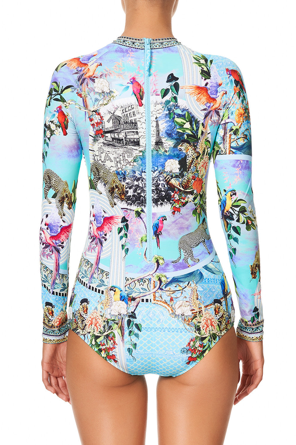 The Girl From St Tropez Paddlesuit is a heartfelt ode to the dappled azure waters of the French Riviera. With turquoise tones, this picturesque placement printed wetsuit features alluring long sleeves, regular leg line, full coverage, zip back closure as well as hand-placed neckline crystals as detail.