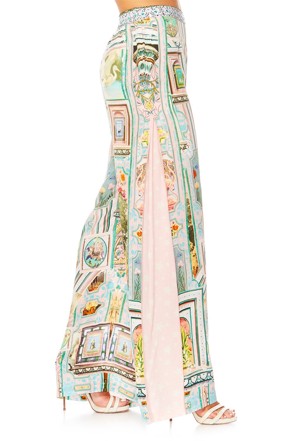 A devotion to Camilla's beloved feminine muses, the Matriarch Musings Pants with Side Split unveil India's picturesque palace scenes with a captivating illustrated print. Handcrafted from pure silk in a relaxed fit silhouette, these statement printed pants feature dramatic thigh-high splits, contrast print side panels and a bejewelled waistband fit for a bohemian queen.