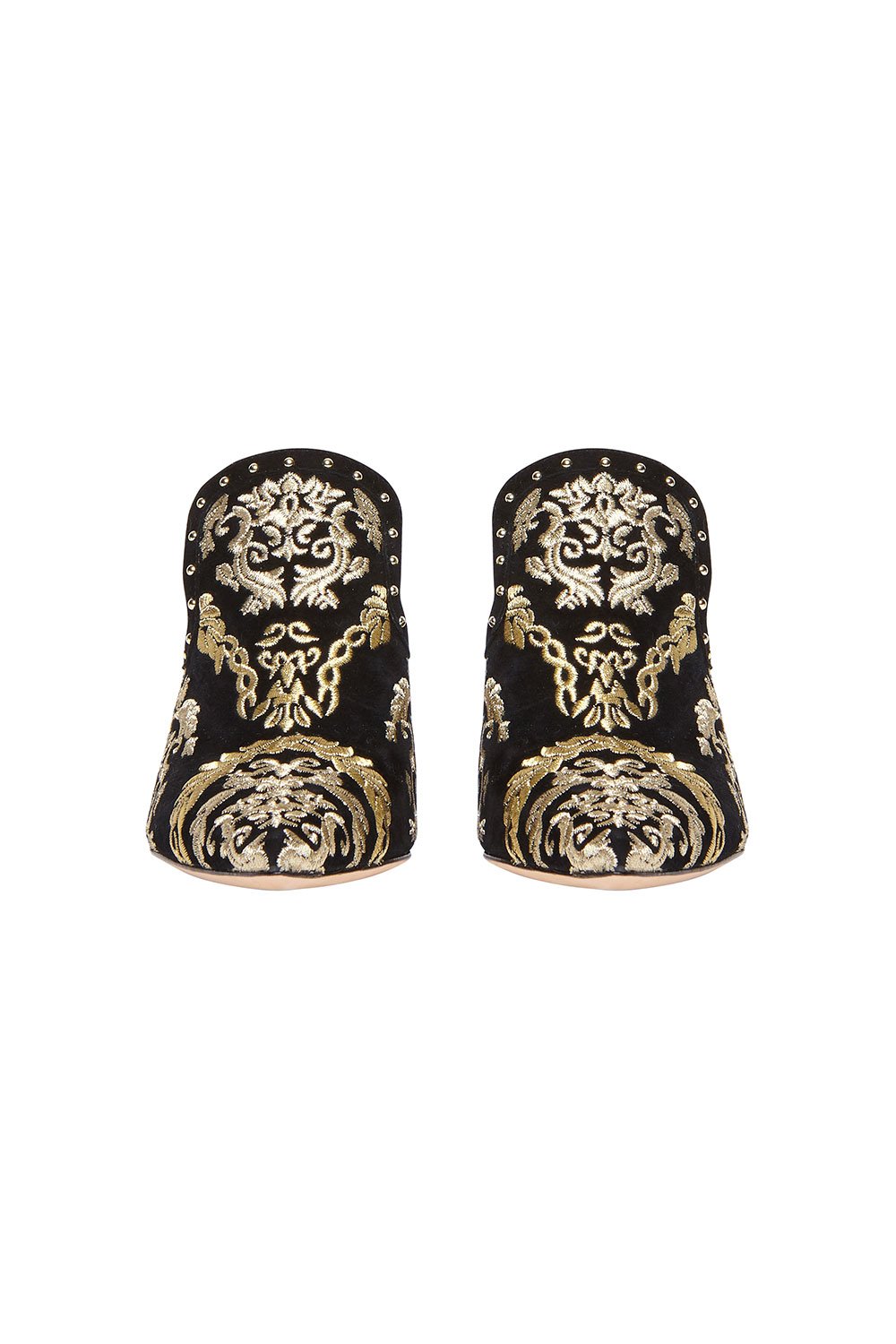 Influenced by effortless French design, the Up All Night Point Heel Mule is casually decadent. These lush heels are 100% leather and feature ornate jacquard design, black suede, golden highlights, and a quilted sock lining.