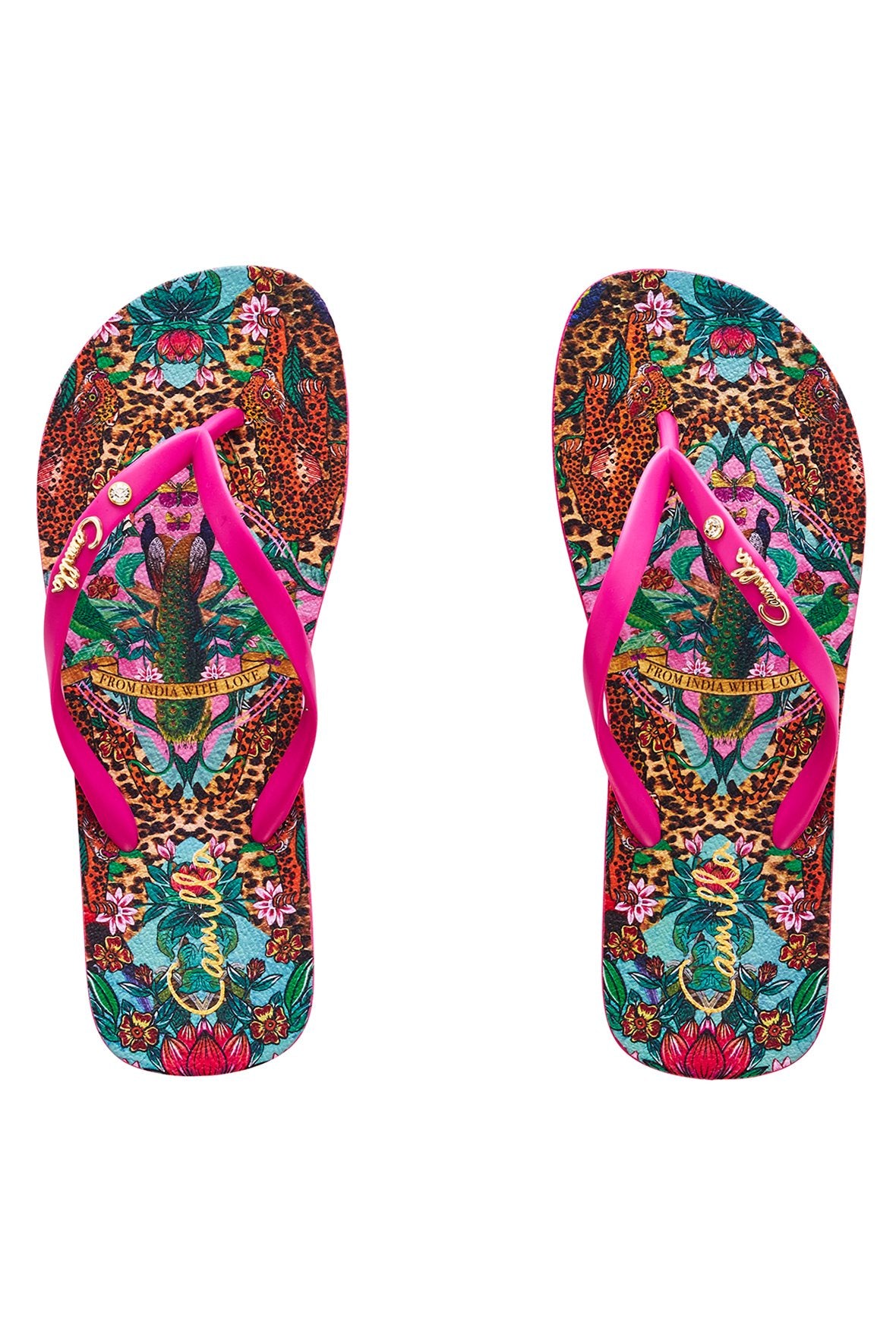 Inspired by Camilla's free-spirited summers with her beloved brother Benny, The Jungle Book thongs are a whimsical exploration of the wild jungles of India, Camilla’s adored second home. Crafted from soft and durable rubber, this relaxed-style footwear features a signature-print shoe bed adorned with a gold CAMILLA logo and luxurious crystal-studded details, perfect for goddesses off-duty.