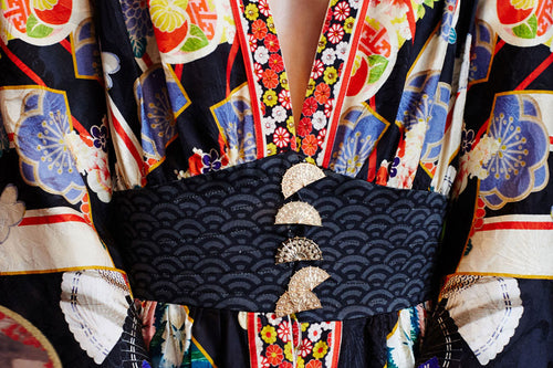 Grooving in a galaxy of femininity, the Star Girl Wrap Dress with Tie evokes the bright blooms of mystical Japan in a rich artisanal print. A vision of graceful wonder, this sensuous wrap-front gown features a softly curving hemline, petite waist tie and a scattering of hand placed crystals for a celestial appeal.